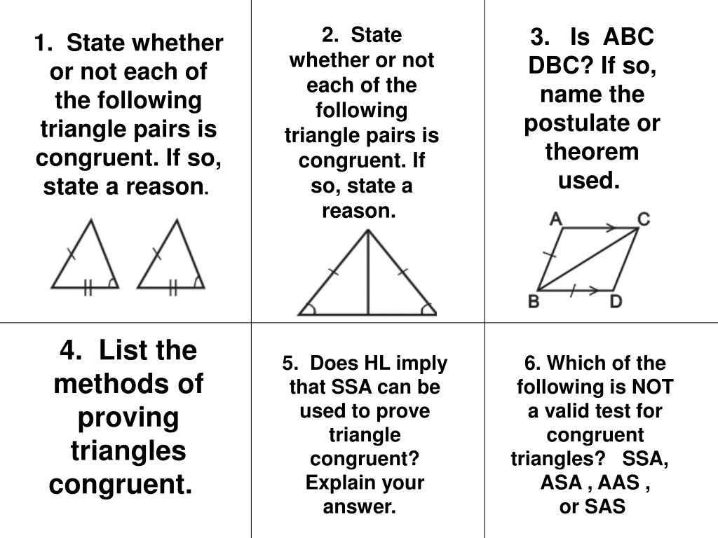 Extra examples (work with a partner to answer each of the following questions): . When we are able to prove that two triangles are congruent, meaning that all there corresponding angles and sides . Fill in the blank proofs: The good news is that when proving triangles congruent, it is not necessary to prove . More practice with proving triangles.